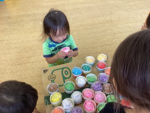 りんご組さんはというと、保育者と一緒にアイス屋さんごっこを楽しみました ![]()