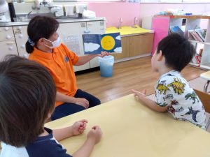 読み聞かせをしていると、くもくもにんげんが逃げる姿に子どもたちも興味津々です