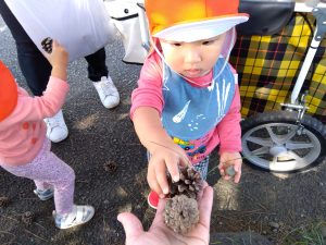 今日はみんな揃って松ぼっくりを拾いに出かけました