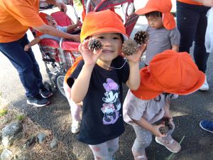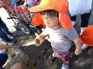 今日はみんな揃って松ぼっくりを拾いに出かけました