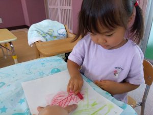 りんご組さんはお散歩のときに拾った葉っぱでフロッタージュという技法で作品を作りました