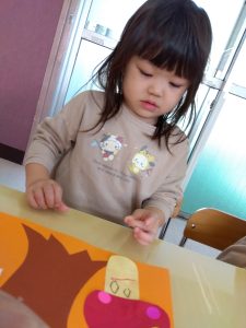 いちご組さんは、お散歩の際に拾った落ち葉を使ってフクロウを作りましたよ