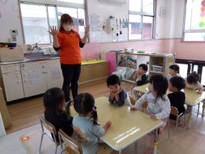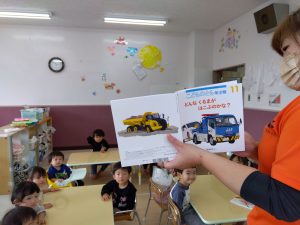 お散歩中などに子どもたちが目にする機会のある車が登場するので、クイズ形式で楽しむことができましたよ