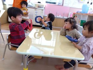 「Wheels on the Bus and Vehicles」の歌では少しバージョンアップして、ハンドルを渡した際に英語で「Thank you!!」と答えてもらい、少しずつやり取りが出来るようになってきました