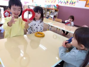 フラッシュカードでは、最初は早く見せてから次にゆっくりと見ていき次に「どっちが正解クイズ!」をやりました2枚で左右どっちが正解か子どもたちに問いかけます保育者の問いかけと違ったカードを提示したときの子どもたちの「NOOOOOOOOOOO!」は力強く合っているカードが出たときの反応は嬉しそうに「イェーイ!!」と反応する子どもたち聴きとる力もついてきています