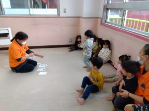子どもたちはまだ、音の長さなどは理解していないようですが、しろ、くろ、はたが出てくることはわかっているようで、保育者を見ながら笑顔で手を叩く姿が見られます