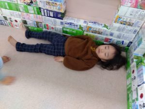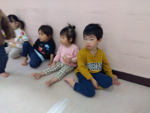 最後は、今までと同じで子どもたちの好きなリトミックスカーフでいないいないばぁをした後、寝転がってお休みをして名前を順に呼ばれ起きて終わりになります