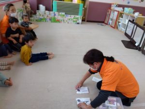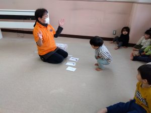 子どもたちはまだ、音の長さなどは理解していないようですが、しろ、くろ、はたが出てくることはわかっているようで、保育者を見ながら笑顔で手を叩く姿が見られます