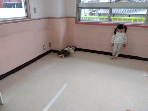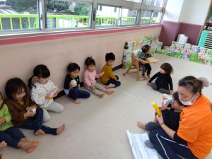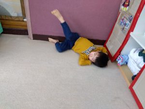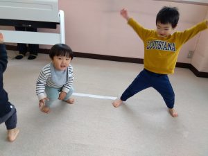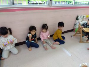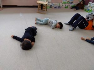 最後は、今までと同じで子どもたちの好きなリトミックスカーフでいないいないばぁをした後、寝転がってお休みをして名前を順に呼ばれ起きて終わりになります