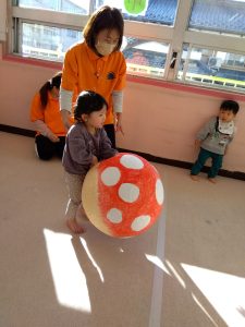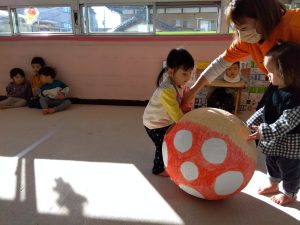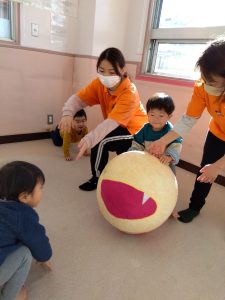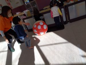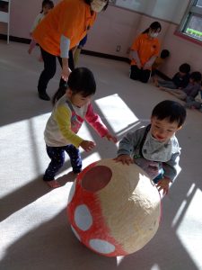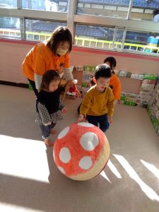 体操カリキュラムの時間にもチャッピーに登場してもらい、転がしてみたり楽しんで子どもたちの身体はポカポカしていました ![]()