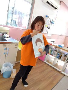 「自分たちの顔にはいくつ目があるか?」「口はどこにあるか?」「耳はどのあたりにあるのか?」など確認しながら前に出て来てもらい貼り付けてもらいました![]()