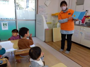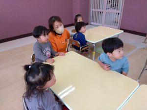読み聞かせている時に「これは、お母さんのお腹の中にいる赤ちゃんの心臓の音なんだよ」と伝えると、自分のお腹を見るお友だちもいました