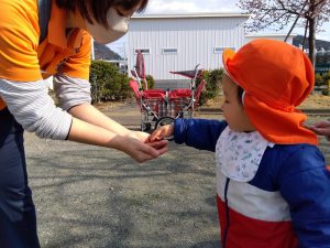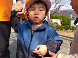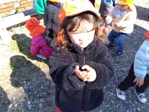 保育者が何個か手に持っていると、次々と「ちょうだい」と子どもたちが持っていきます