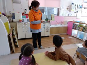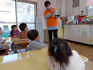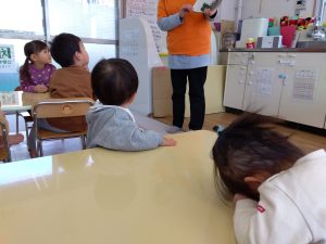 お話に登場する「わに」ですが、なかなかインパクトのあるイラストで、子どもたちも最初は少し怖いイメージを持つ子も![]()
