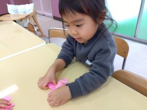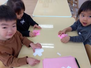りんご組さんは、桜色のお花紙を上手に貼り付けてお花を咲かせます
