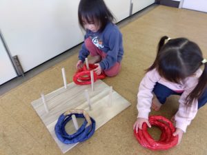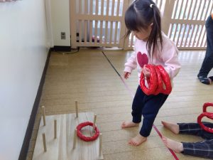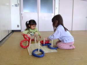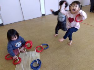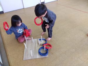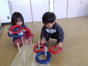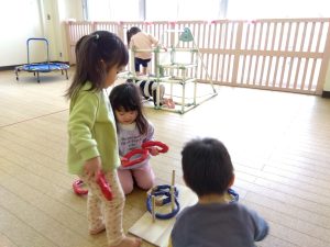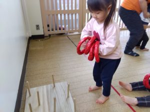 輪投げを出すとお友だちにも輪を渡してあげたり、輪を投げる位置にこだわったり、色々考えながら遊ぶ子どもたち ![]()