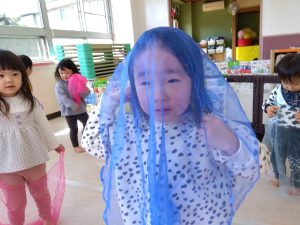 最後は、今までと同じで子どもたちの好きなリトミックスカーフでいないいないばぁをします![]()