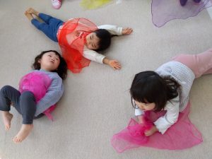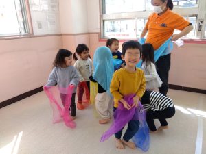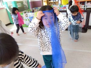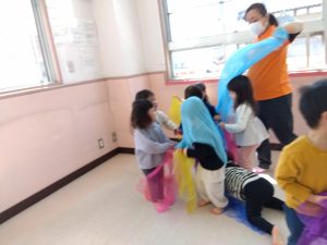 最後は、今までと同じで子どもたちの好きなリトミックスカーフでいないいないばぁをします![]()