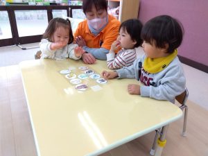 保育者が発音した単語を、テーブルに並べたカードから探してタッチしていきます![]()