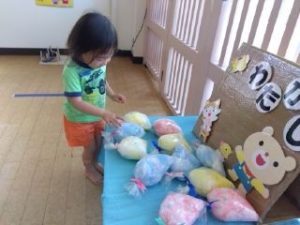 保育者が準備したわたがしをお買い物ごっこしたり、ヨーヨー釣りを楽しみましたよ