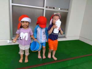 陽射しが強いものの、なのはな保育園の園庭には大きな屋根があるので日陰で水遊びを楽しむことができます