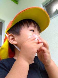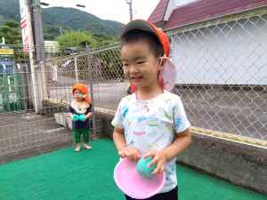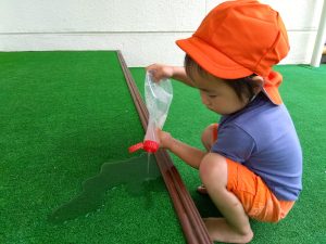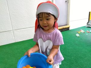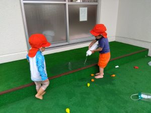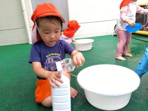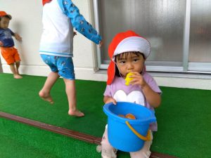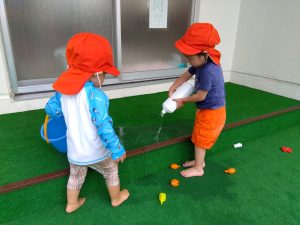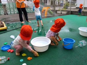 陽射しが強いものの、なのはな保育園の園庭には大きな屋根があるので日陰で水遊びを楽しむことができます