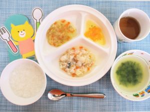 (写真は中期食です。月齢によって形、固さ、盛り付け量を変えて提供しています。)