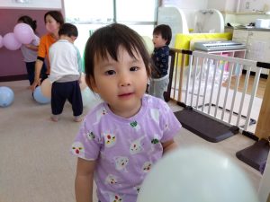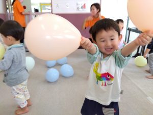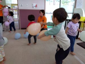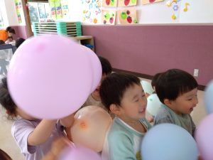 2歳児りんご組さんは、風船を両手に持って戦いごっこの真似をしたり、床に落とさないように上手にポンポンと上にあげてお友だちと楽しく笑い合っていました