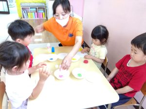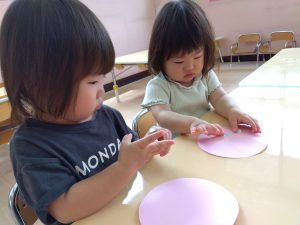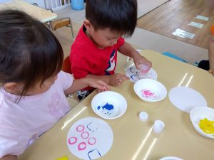 丸や四角などの形のスタンプ遊びを楽しみました
