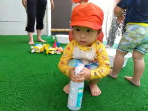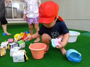 暑さ対策で時間を短縮しながらも水遊びを楽しんだり、室内遊びを楽しむ子どもたち ![]()