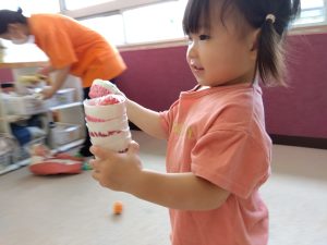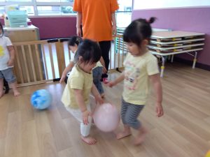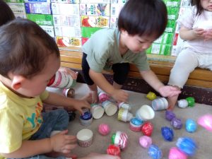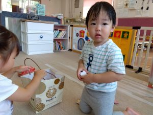 これまでは保育者を相手にして遊ぶことの多かったのですが、お友だち同士でお話しをしながら楽しむ様子も見られます