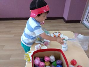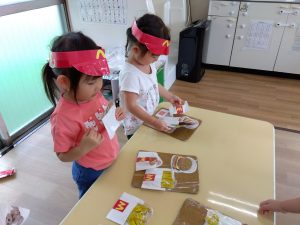 週末に、夏祭りごっこでお店屋さんのお手伝いをしてもらいたいなあと思っています