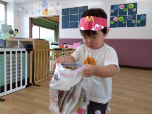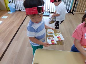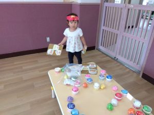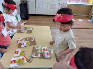 2歳児のりんご組さんが、お店屋さんごっこを楽しんでいました