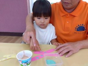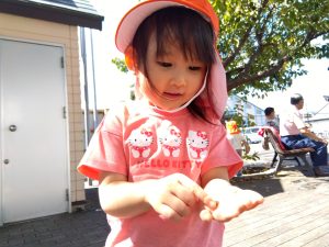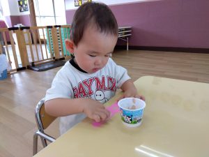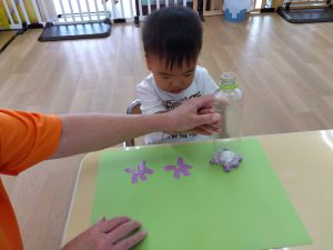 お友だちの中には、普段見慣れていたペットボトルに見慣れないスポンジがくっついていて取ろうとしていた子もいました