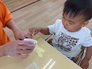 1歳児クラスの製作では、秋を感じられる「コスモスやトンボ」が登場しました
