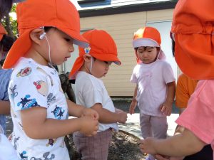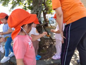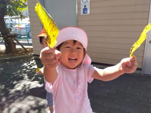 木の下には落ち葉がたくさん落ちていて、2歳児クラスのお友だちは手でそっと触ってパリパリする感触を楽しんだり、ポーンと投げて遊んでいました