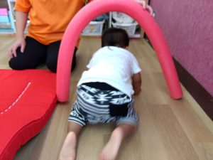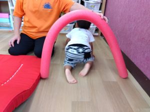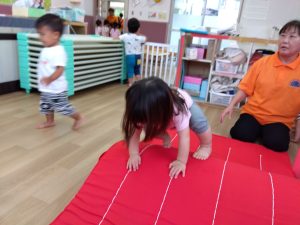 0歳児クラスのお友だちもサーキットには参加できないながらもマットの上を這ったり、お山に登ったりして参加しています