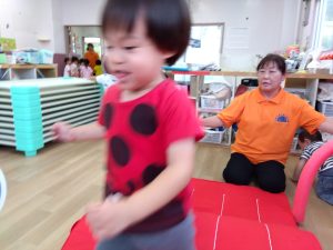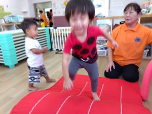 2歳児クラスは、昨年マットを経験しているので覚えている子もいて、マット上でクマさん歩きをしたり、身体を伸ばして転がったり楽しそうな表情が見られました
