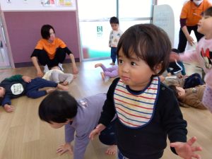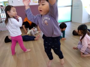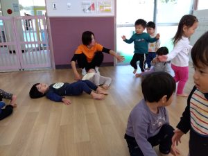 ストップ&ゴーでは、曲が止まった時に、ハンドサインを取り入れることを行なってみましたが、少し難しい様で、子どもたちは、不思議そうな表情で立ち止まっています