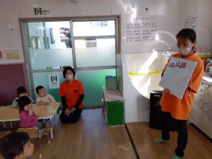 最初に保育者が「消防の音を聴かせてあげると、子供達から次々に「パトカー、消防車、救急車!!」と声が上がっていました
