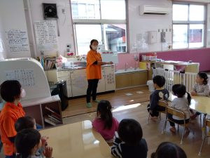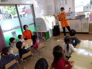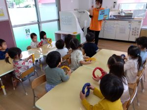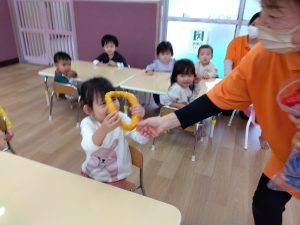 もらった際に、保育者が「Here you are.」と話すと子どもたちから「Thank you!」と声が返ってきました