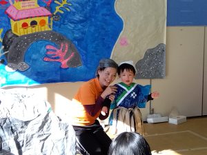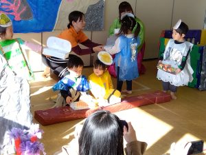 一瞬表情が固まる園児さんもいましたが、一緒にごちそうを並べたり、受け答えもしっかりしてくれていました