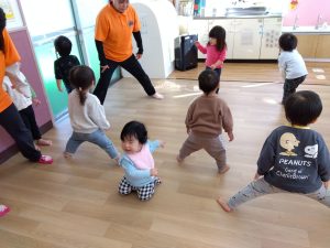 1歳児さんも一緒にマットの上を「ハイハイ」「くまさん歩き」など色々な歩き方を楽しんでいます