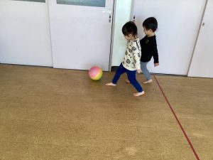 ボール遊びでは、2歳児クラスのお友だちはサッカーごっこをしてみました![]()