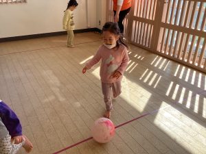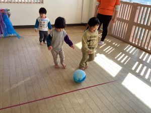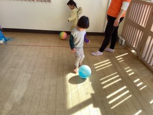 ボール遊びでは、2歳児クラスのお友だちはサッカーごっこをしてみました![]()