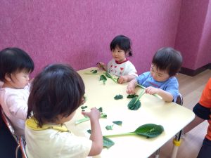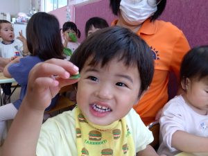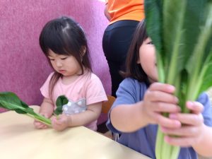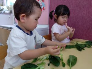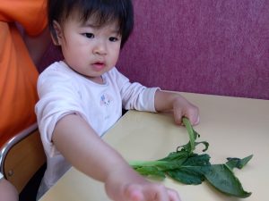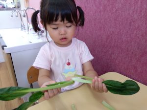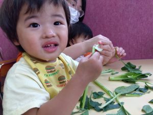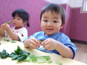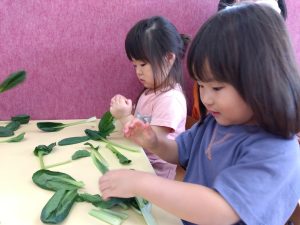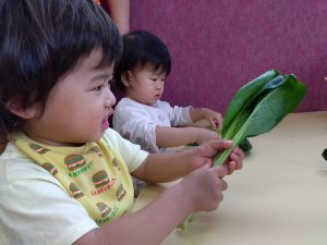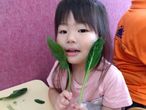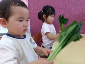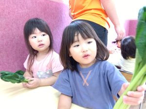 給食の時間にも「おじさんが畑で作ってくれた小松菜かも〜」と伝えると、普段は口にしようとしなかったお友だちも「おじさんの小松菜食べたよ」と報告してくれました