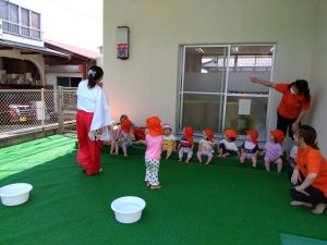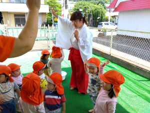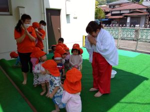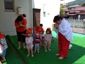 2歳児クラスのお友だちは、巫女に扮した保育者と一緒に2拝1礼をしてお祈りをしました ![]()