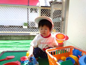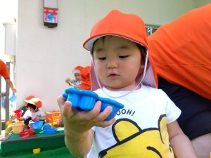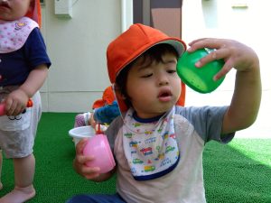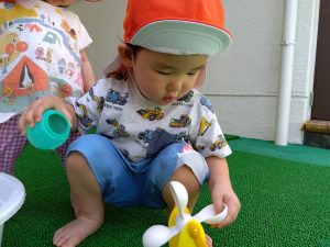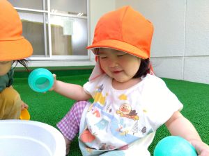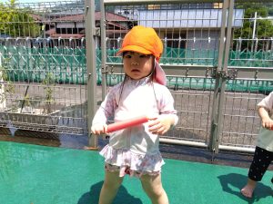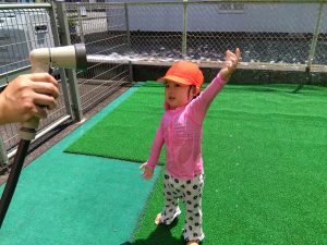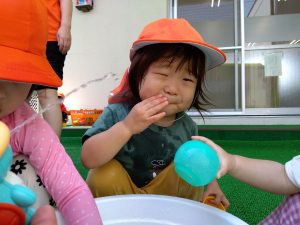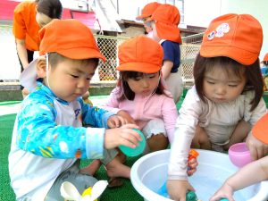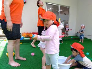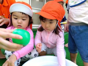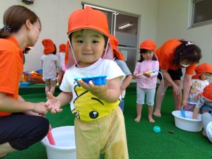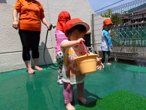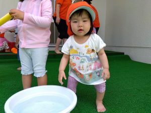 水が苦手な園児さんも、少しずつ水に触れる場面を増やして慣れてもらいました