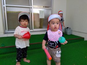 0.1歳児クラスのお友だちは、その様子を不思議そうに見つめていました ![]()