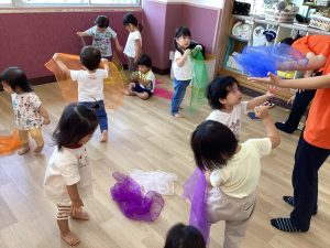 4月から取り組んでいるいちご組のお友だちも覚えてきていて、保育者や昨年度から取り組んでいるりんご組のお友だちを真似して楽しんでいます![]()